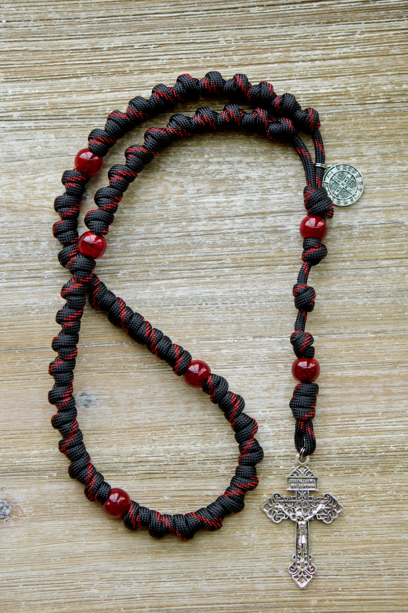 This powerful rosary is crafted from durable paracord 550 rope, symbolizing the "Blood of Christ" in The Passion. The bold red Our Father beads add to the symbolism of the piece, while the intricately knotted Hail Mary knots showcase the craftsmanship and devotion that went into creating this unique rosary. The Pardon Crucifix and St. Benedict medal provide a touch of tradition, adding to the spiritual significance of the piece. Whether used as a daily devotional tool or as a meaningful gift, this compact and sturdy rosary is sure to inspire reflection and spiritual growth.