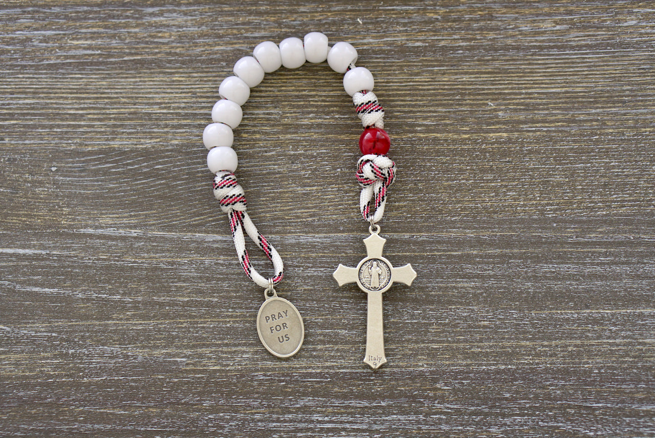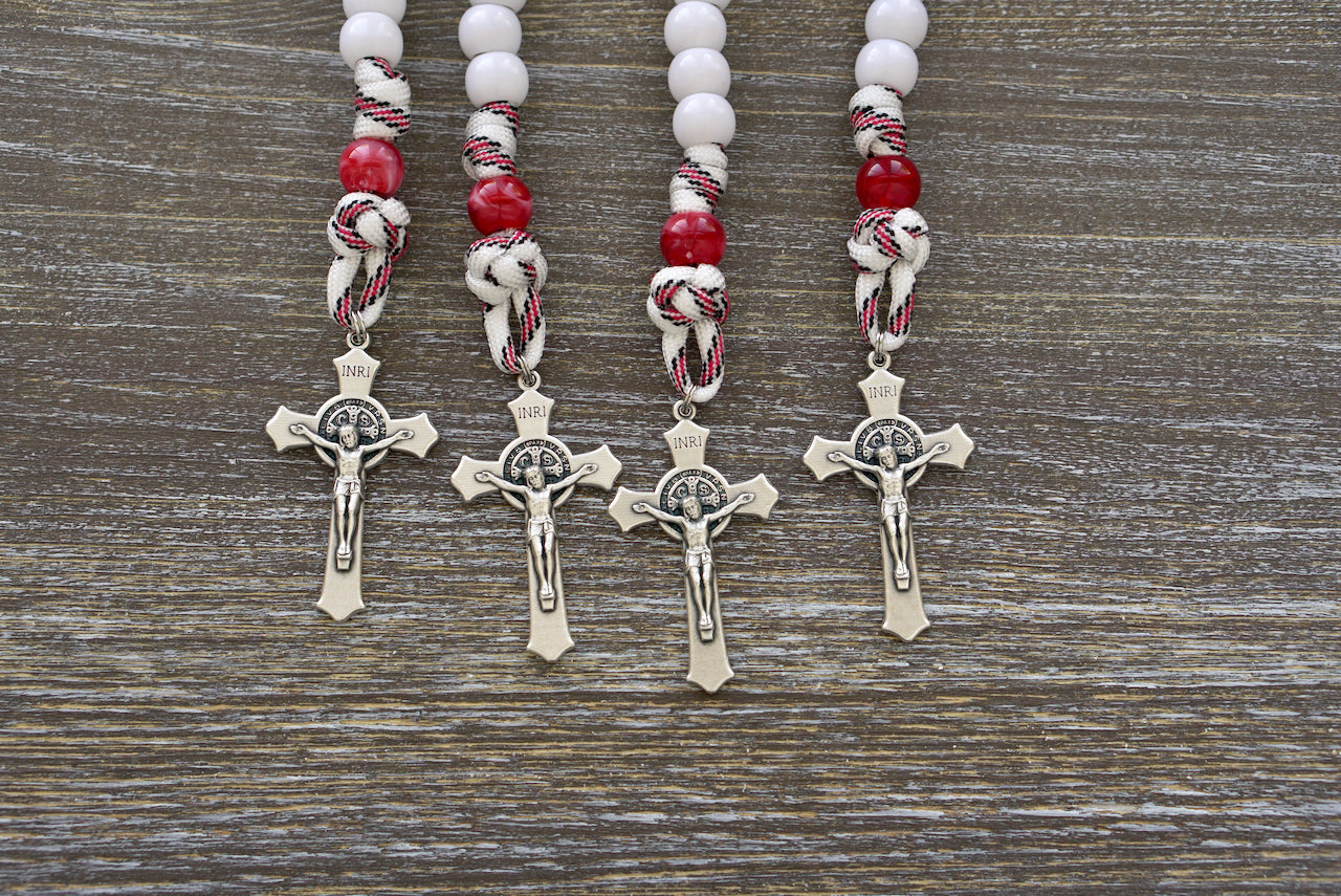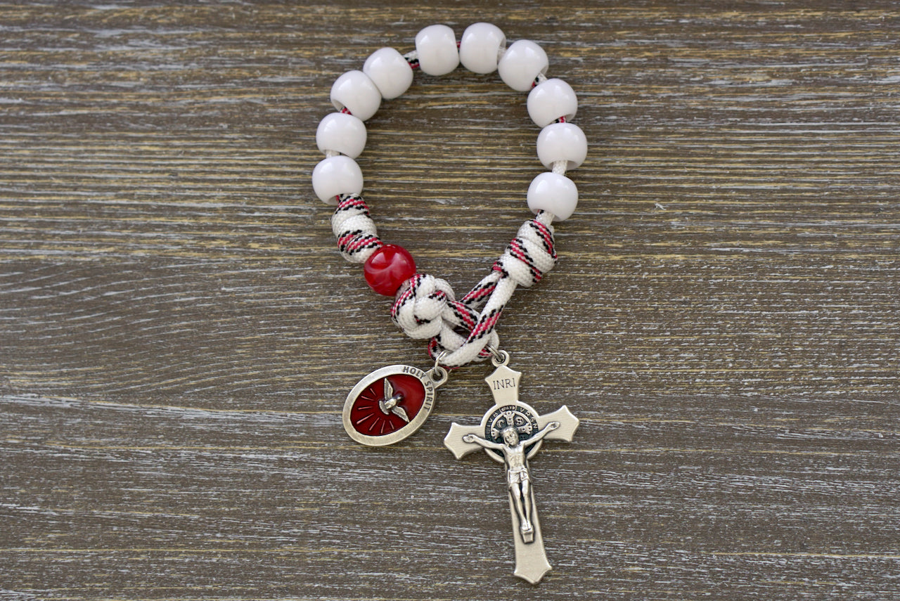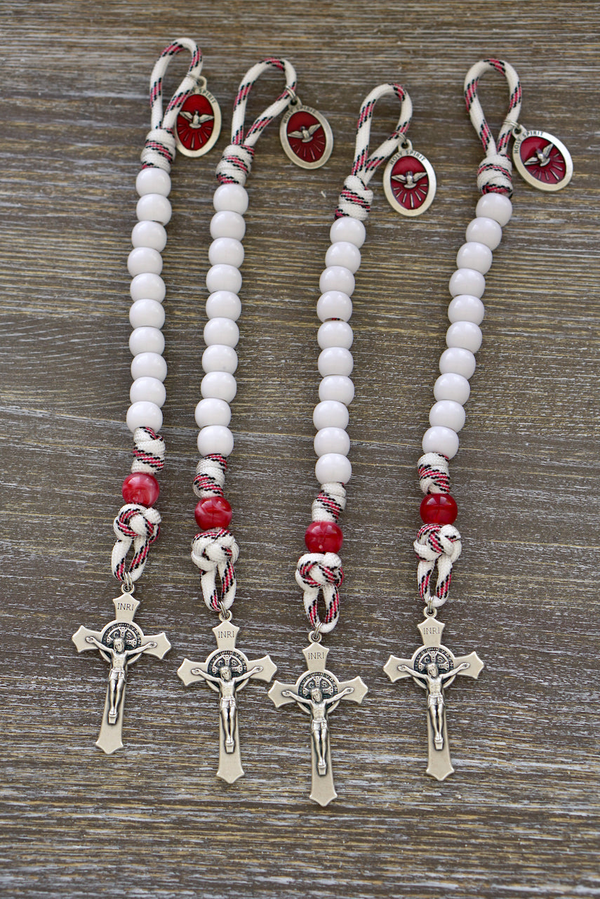 Celebrate your Confirmation with this stunning paracord rosary! This bright, bold red and black stripes on a white rope make a statement, reflecting your strong faith and dedication to the Holy Spirit.