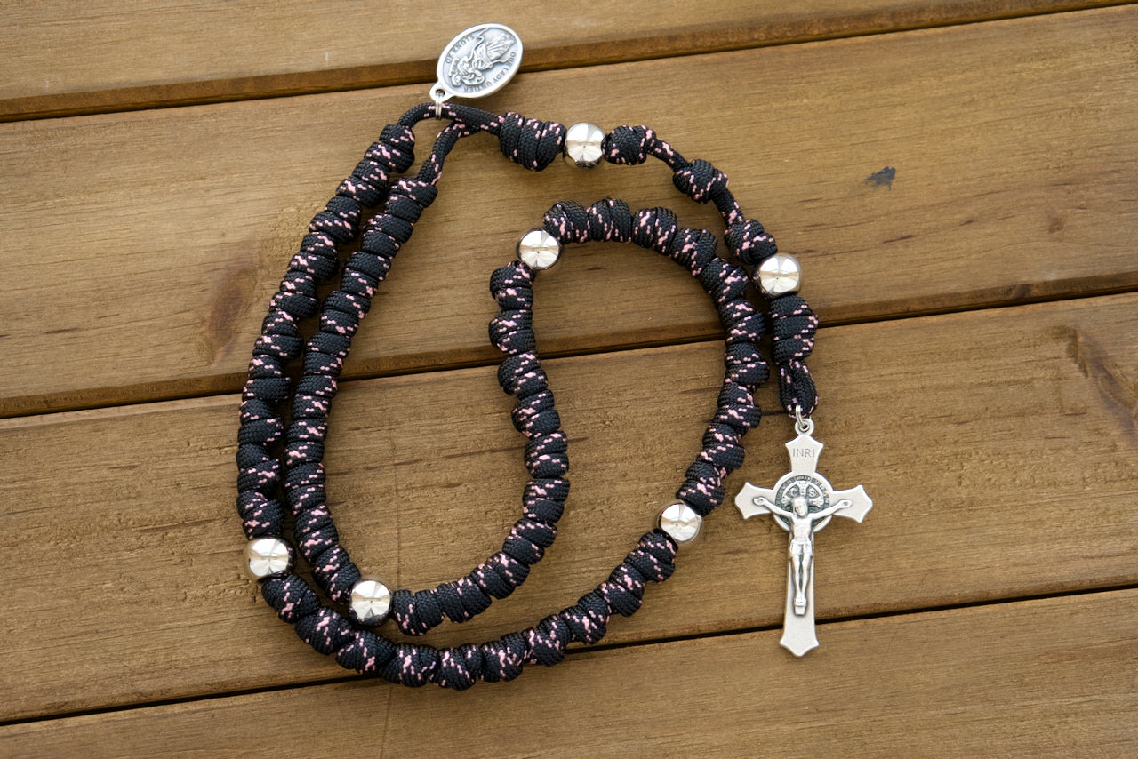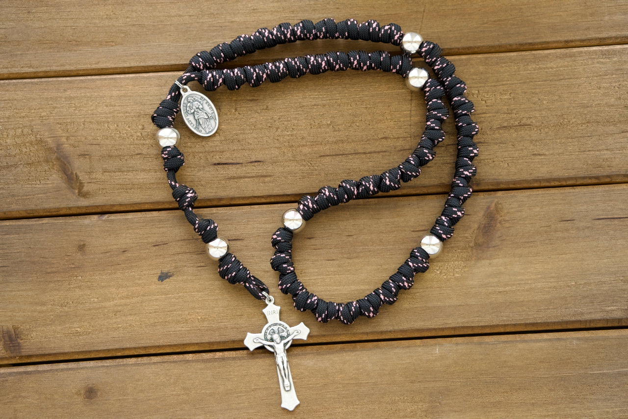This stunning knotted rope rosary features an intricate design made from black and light pink paracord. The high-quality knotwork not only makes this rosary both visually striking and comfortable to hold, but it also symbolizes the strong bond between you and our heavenly protector, Our Lady Untier of Knots.