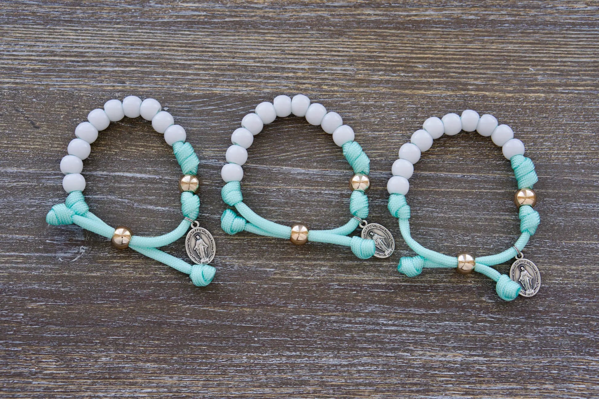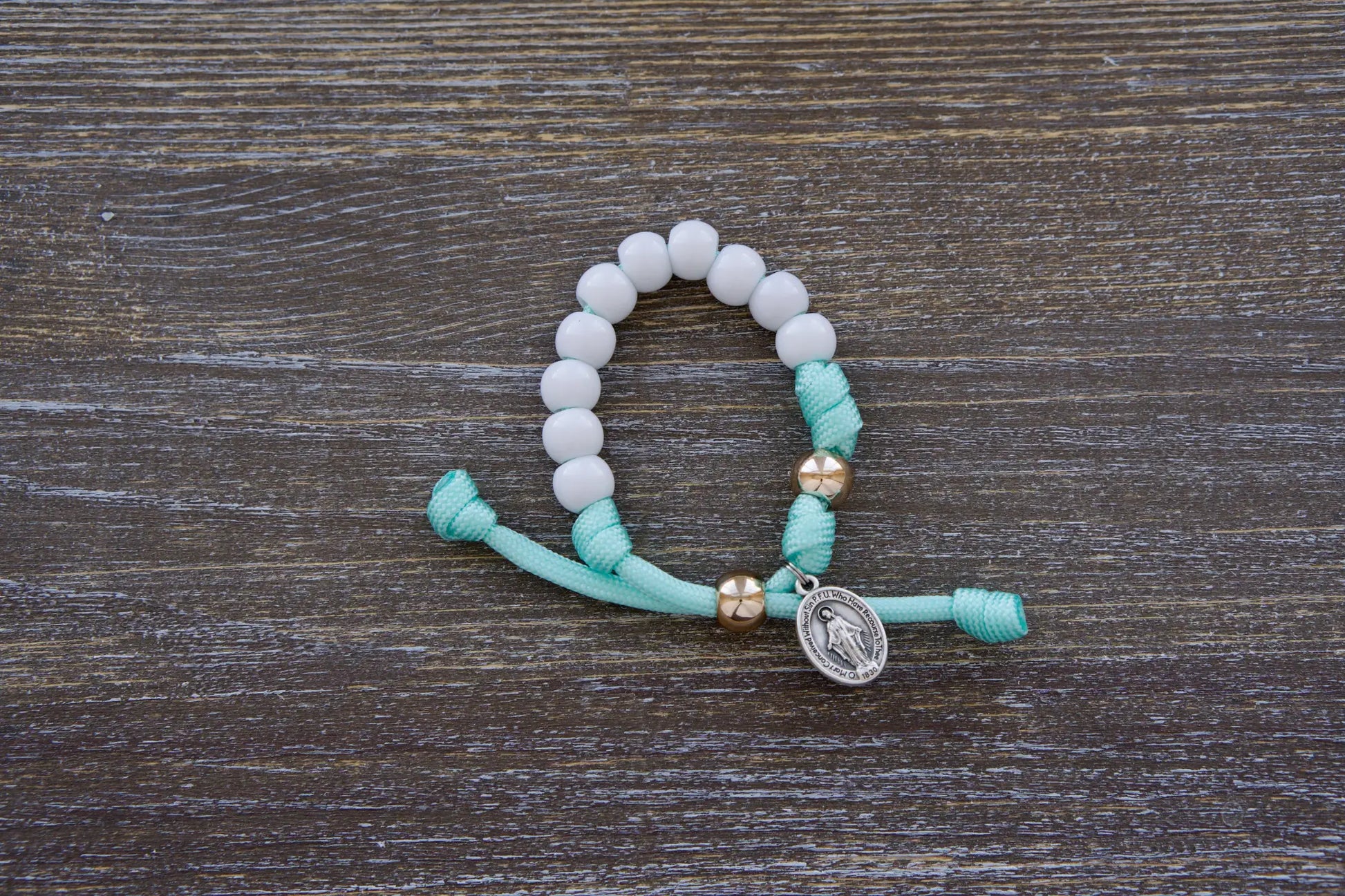 Discover Sanctus Servo's new Mint Green Kid's Rosary Bracelet - your child's perfect spiritual weapon! Made with mint green rope, this handmade bracelet boasts small white beads (10mm) signifying Hail Mary prayers and a rose gold Our Father bead. Topping it off is a tiny Miraculous Medal, sure to delight children. This rosary bracelet is designed specifically for smaller wrists, making it the ideal accessory for young Catholics on their spiritual journey!