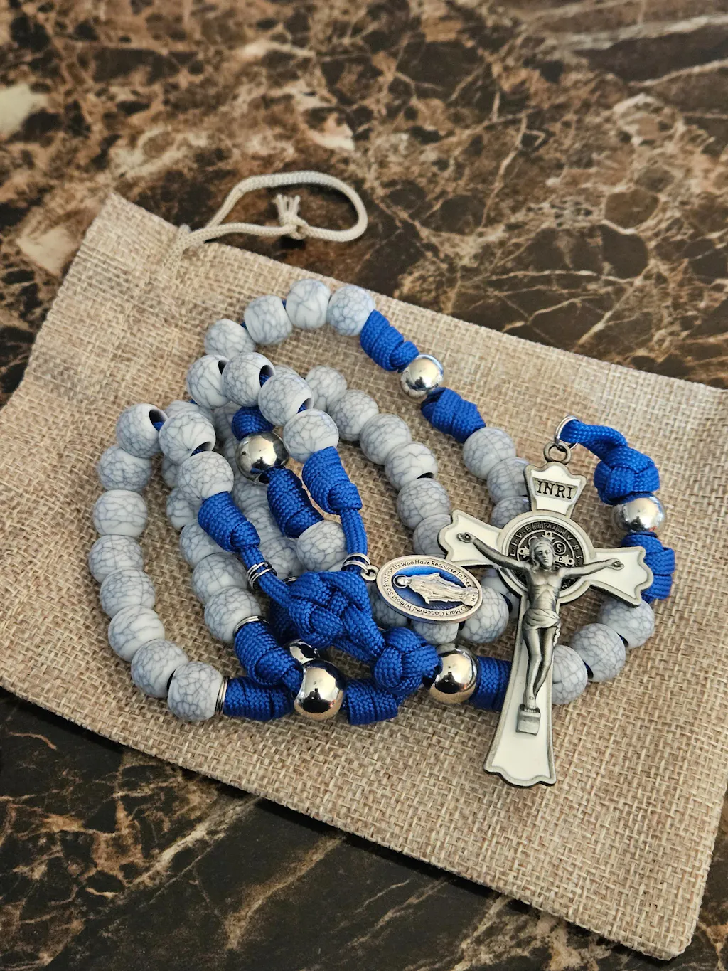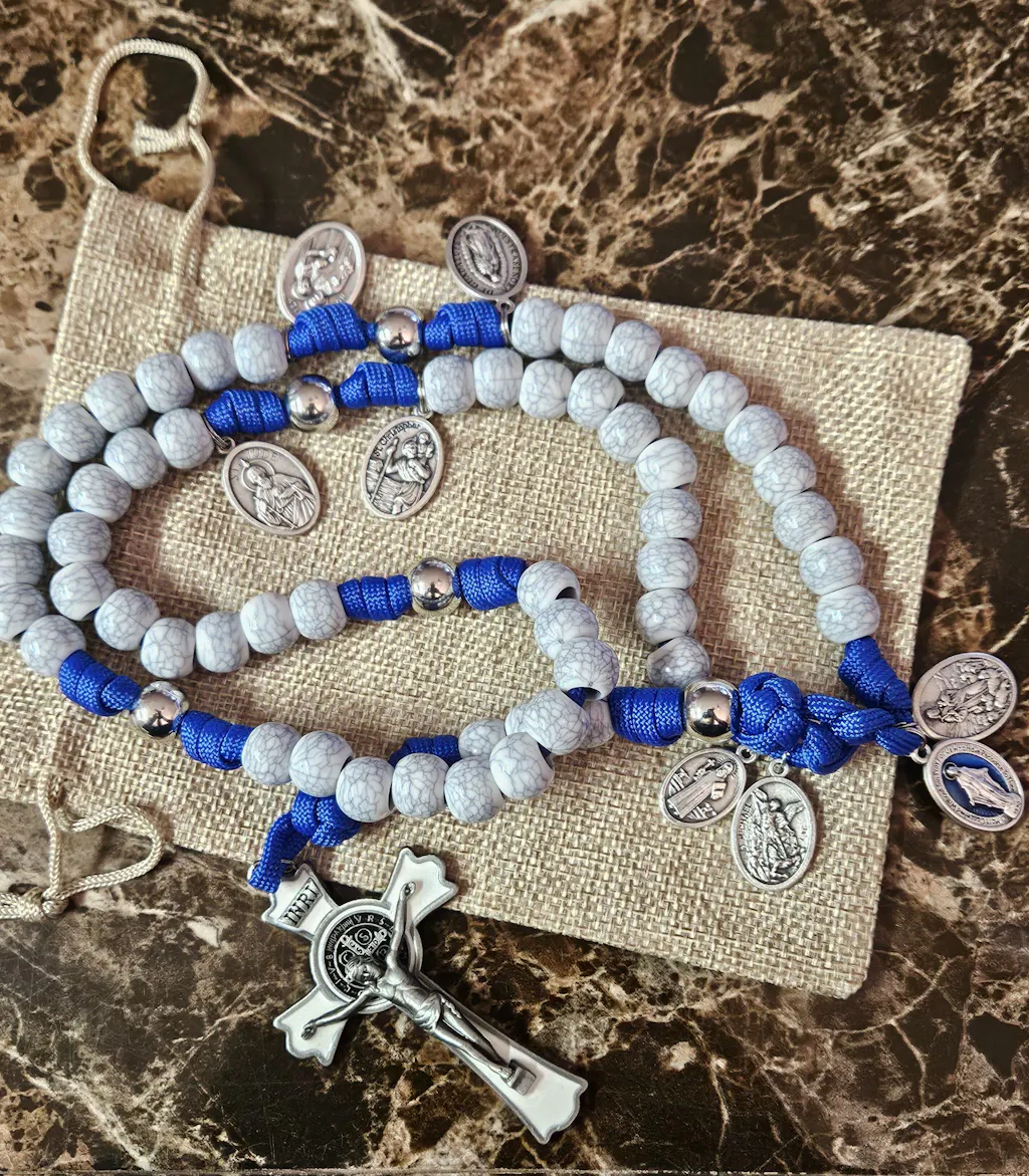 Included on this rosary is a beautiful 3" white enamel St. Benedict Crucifix. This spiritual weapon stands out not just for its beauty but also for its practicality. The devotional medal paired on this rosary showcases a striking blue Miraculous Medal that matches perfectly with the rope of this rosary.