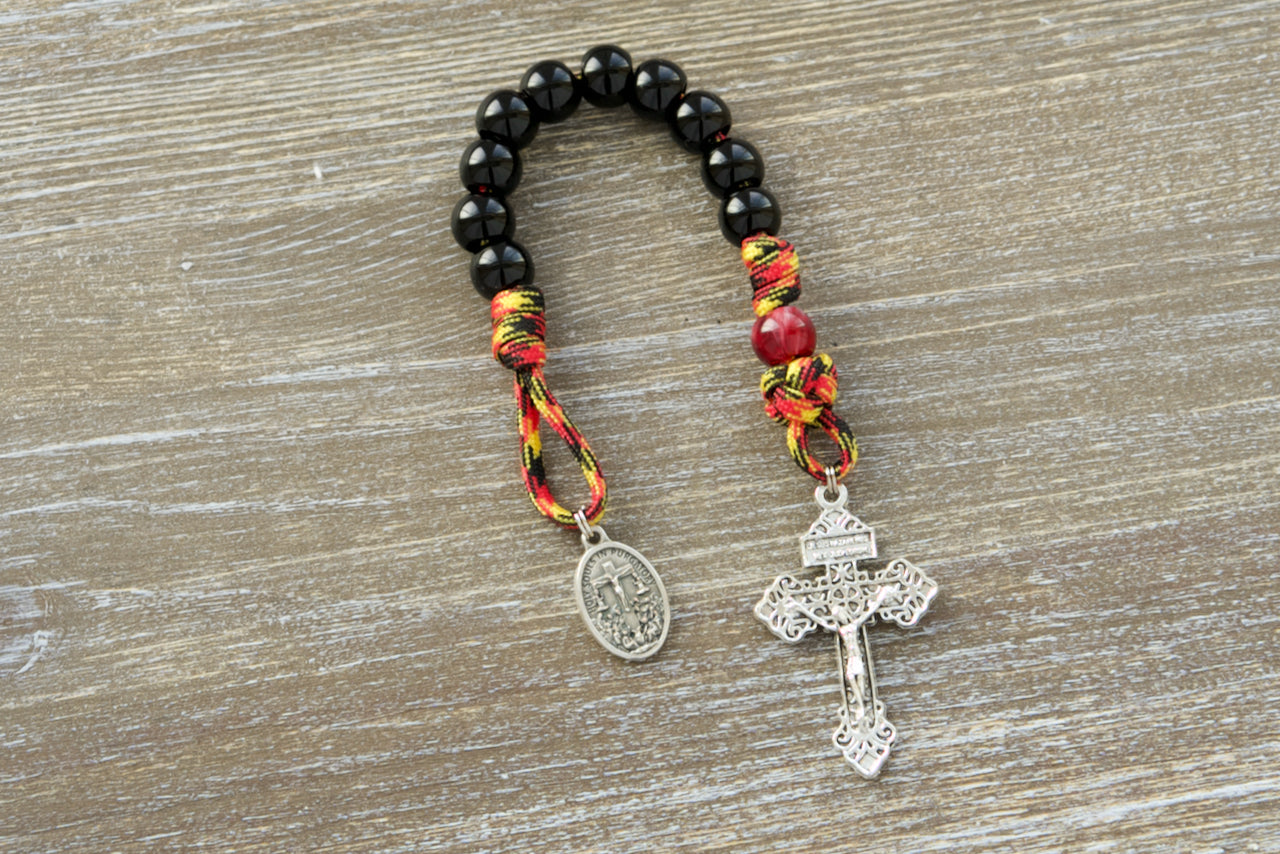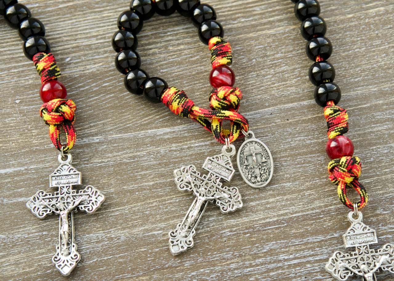 Introducing our latest spiritual arsenal - the "Purgatory Releaser" Pocket Paracord Rosary, your ultimate weapon for intercession! This unique rosary, crafted with unyielding durability in mind, is designed to conquer any challenge on life's battlefield. Featuring a vibrant red and orange hue, this 550 paracord masterpiece boasts 12mm acrylic beads, a Holy Souls in Purgatory devotional medal, and a powerful 2-inch Pardon Crucifix. Our meticulously tested designs, perfected with the help of young warriors, ensure unbreakable strength for your spiritual journey. Join us in releasing souls from Purgatory with this extraordinary paracord rosary - a true gamechanger on your path to divine victory!